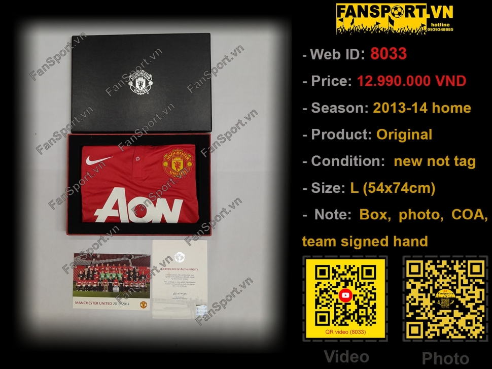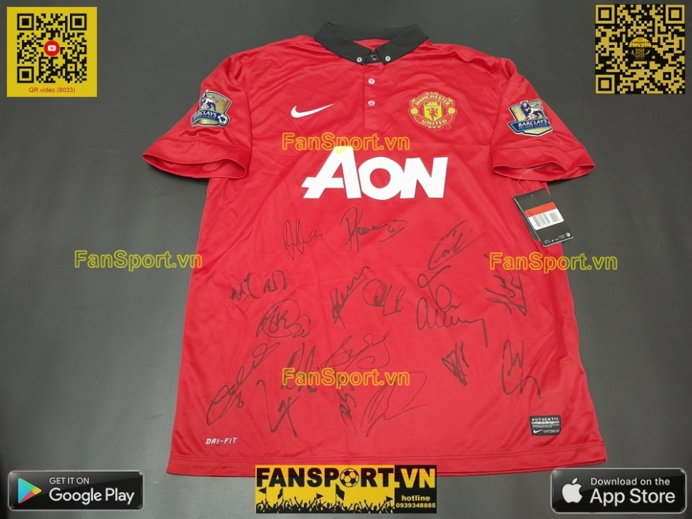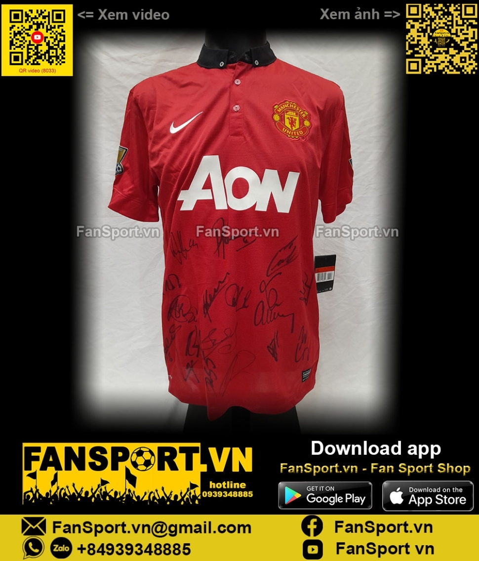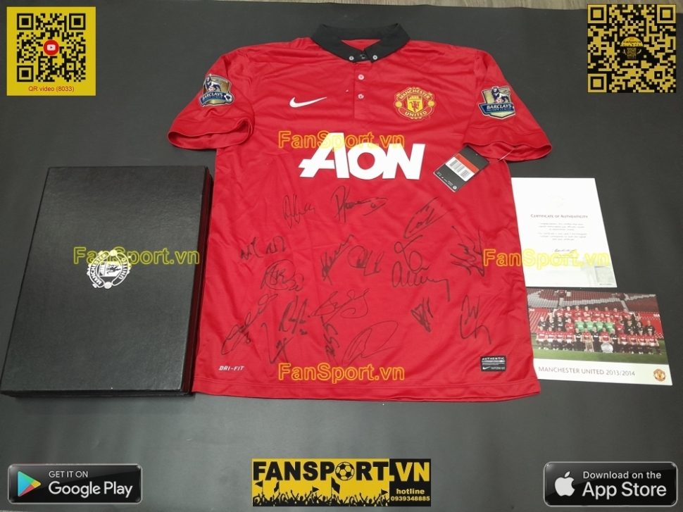 Kiểu áo sân nhà của ManUtd mùa giải 2013-2014, đây là mùa giải cuối cùng của nhiều cầu thủ tên tuổi tại ManUtd như Giggs, Vidic, Ferdinand... Set vật phẩm bạn đang xem là set quà tặng của ManUtd giành tặng các đối tác gồm hộp màu đen với viền đỏ, áo sân nhà mùa giải 2013-14 với 18 chữ ký tay của các cầu thủ, đi kèm là photo đội hình 2013-14 với chữ ký mẫu in sau của cả đội hình, ngoài ra còn có Giấy chứng nhận từ câu lạc bộ (COA) với tem chứng nhận được dán trên COA và trên áo.