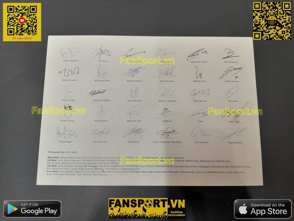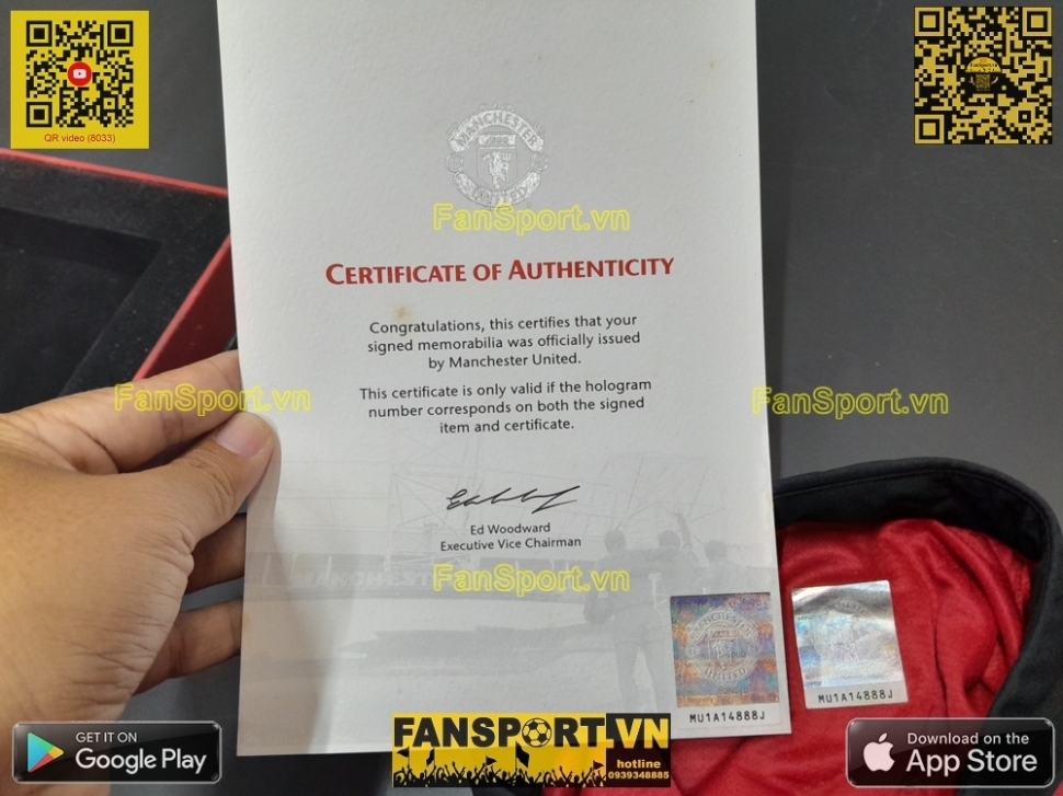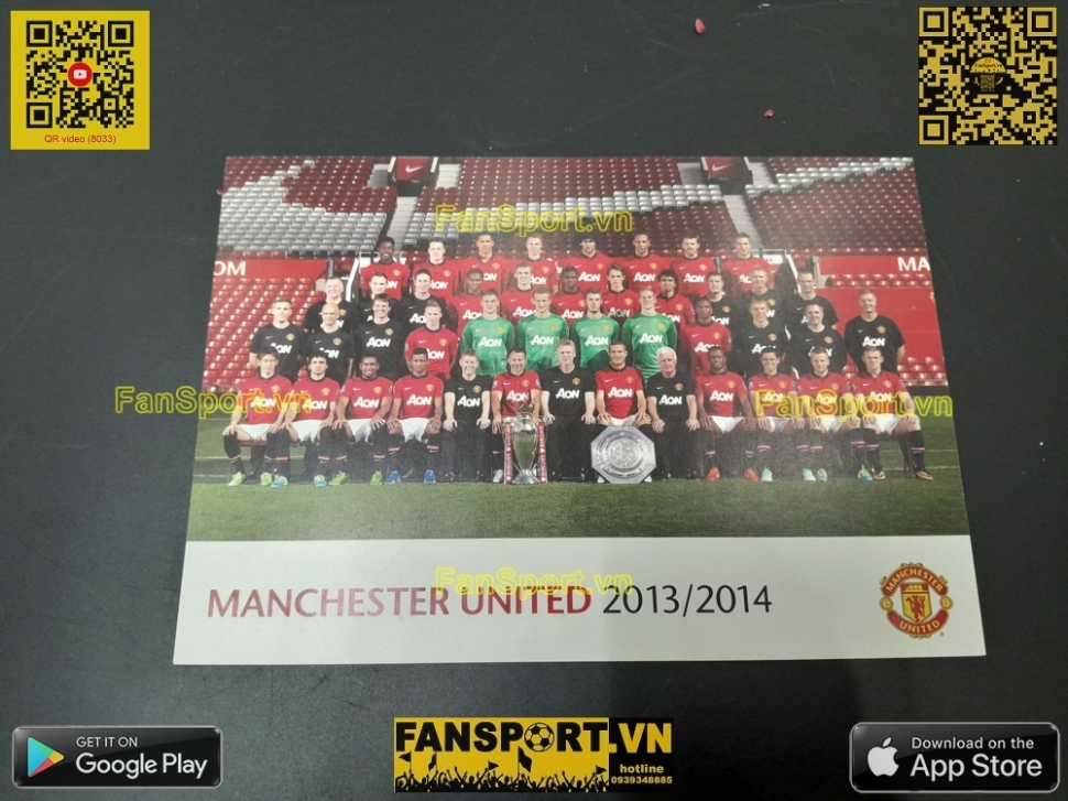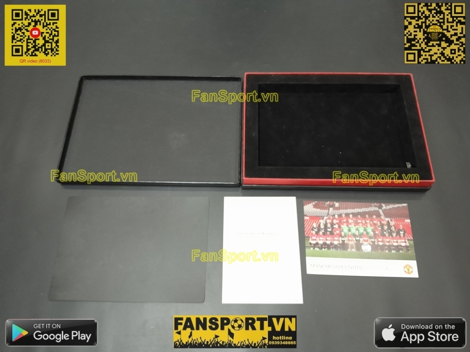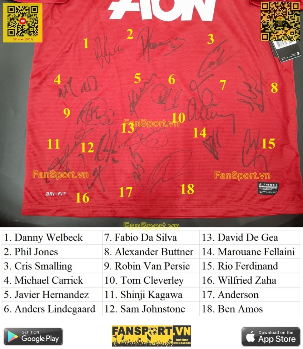 Kiểu áo sân nhà của ManUtd mùa giải 2013-2014, đây là mùa giải cuối cùng của nhiều cầu thủ tên tuổi tại ManUtd như Giggs, Vidic, Ferdinand... Set vật phẩm bạn đang xem là set quà tặng của ManUtd giành tặng các đối tác gồm hộp màu đen với viền đỏ, áo sân nhà mùa giải 2013-14 với 18 chữ ký tay của các cầu thủ, đi kèm là photo đội hình 2013-14 với chữ ký mẫu in sau của cả đội hình, ngoài ra còn có Giấy chứng nhận từ câu lạc bộ (COA) với tem chứng nhận được dán trên COA và trên áo.